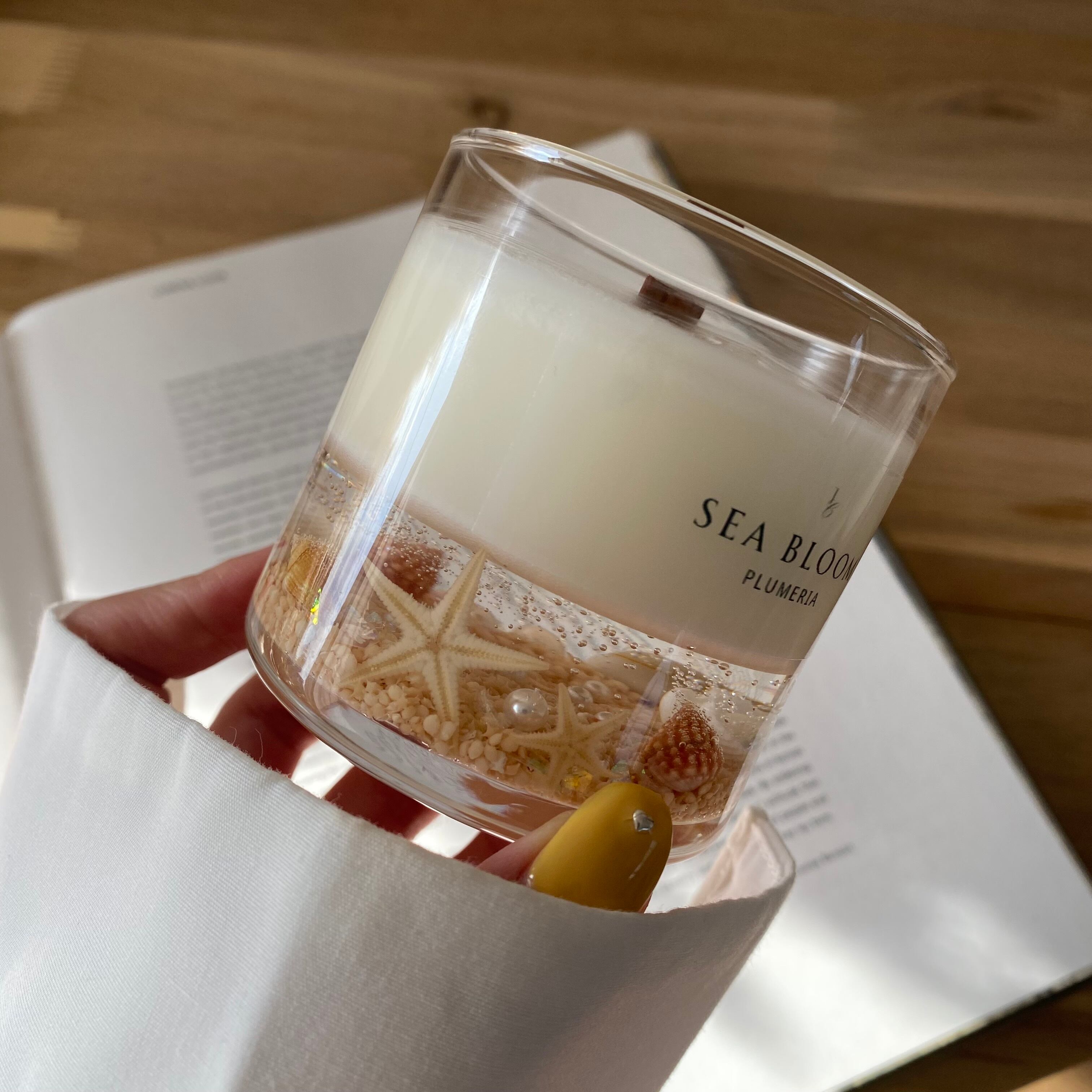 海辺を思わせる透明感と、星の砂や貝殻たちがきらめく夏のキャンドル。
