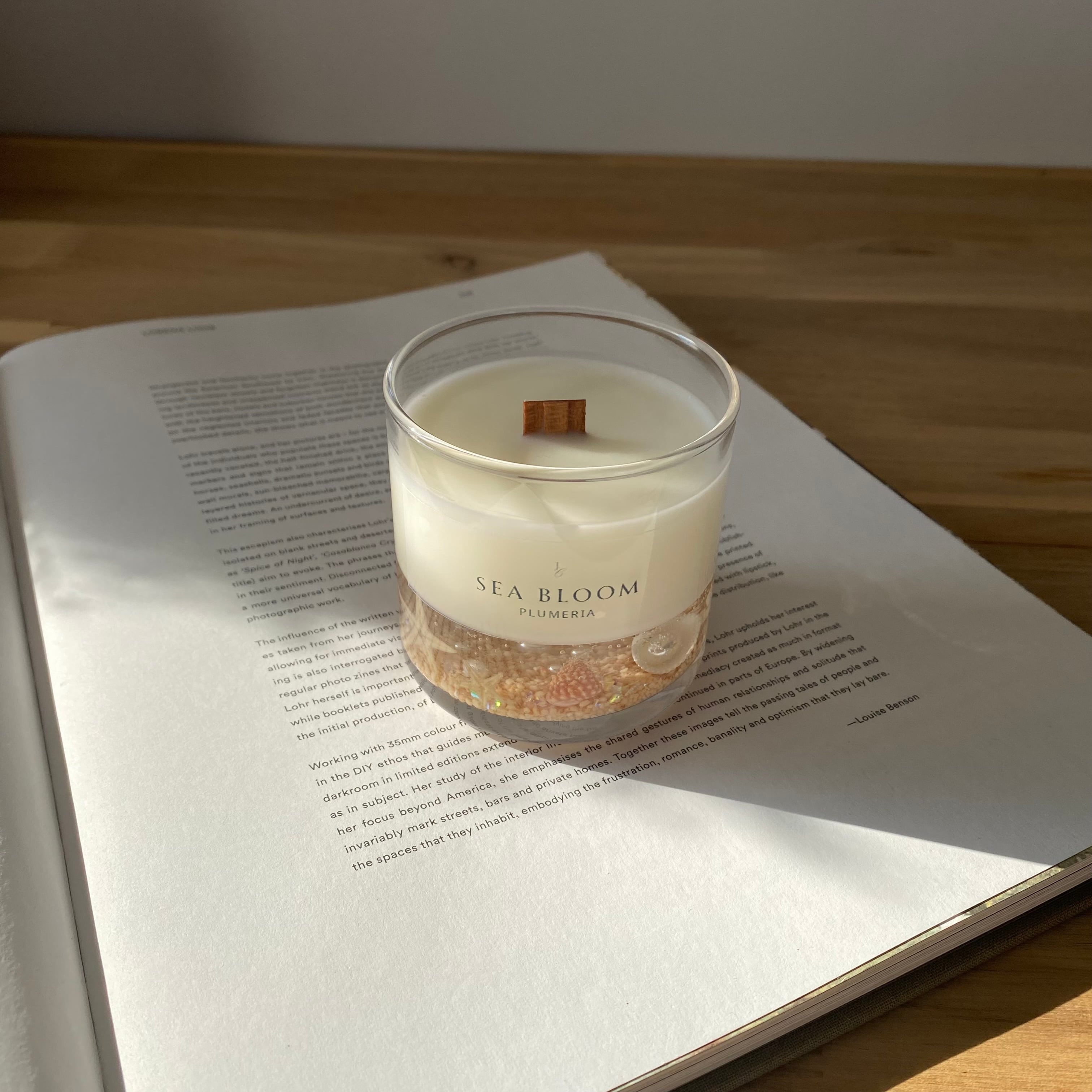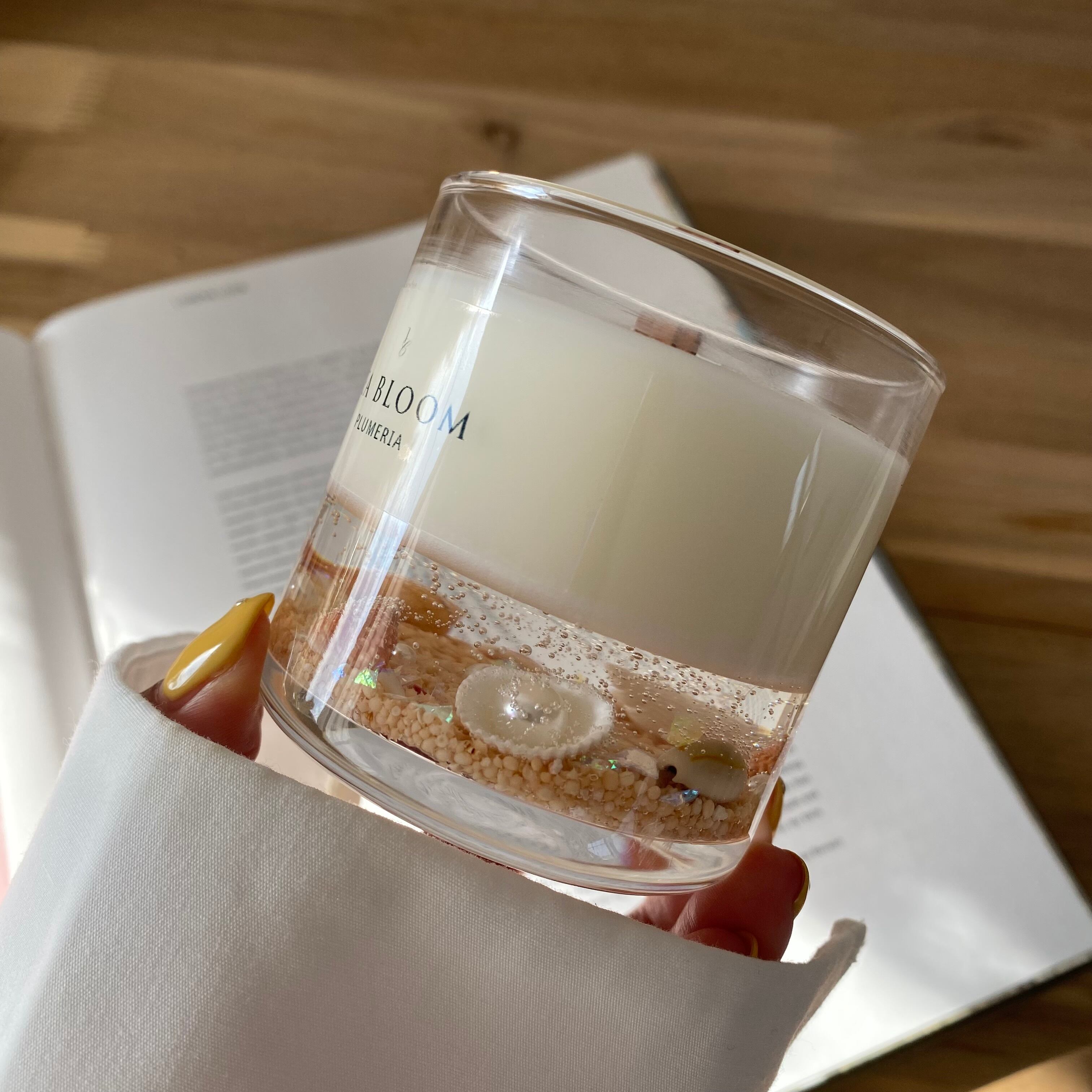 燃焼部分には天然ソイワックスを使用し、火を灯すと南国を思わせる甘く華やかなプルメリアの香りがふんわりと広がります。