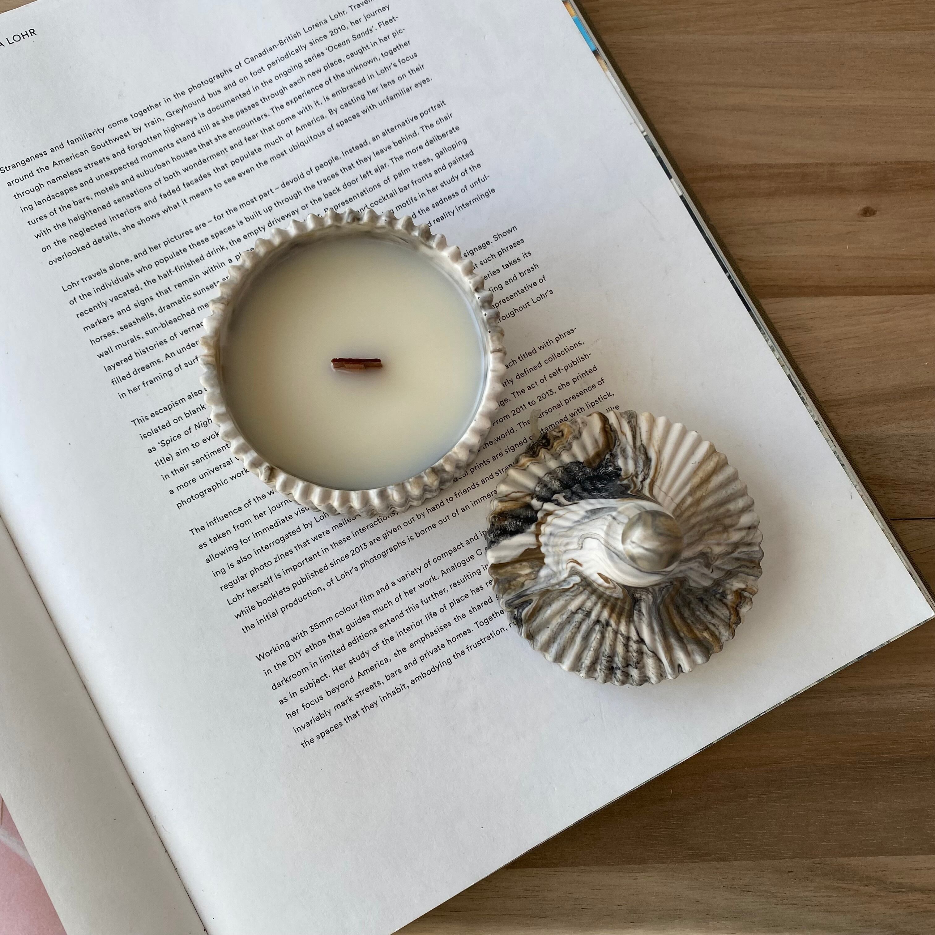 繊細なシェルのようなデザインが印象的な容器は、ジェスモナイトで丁寧に仕上げた一点もの。