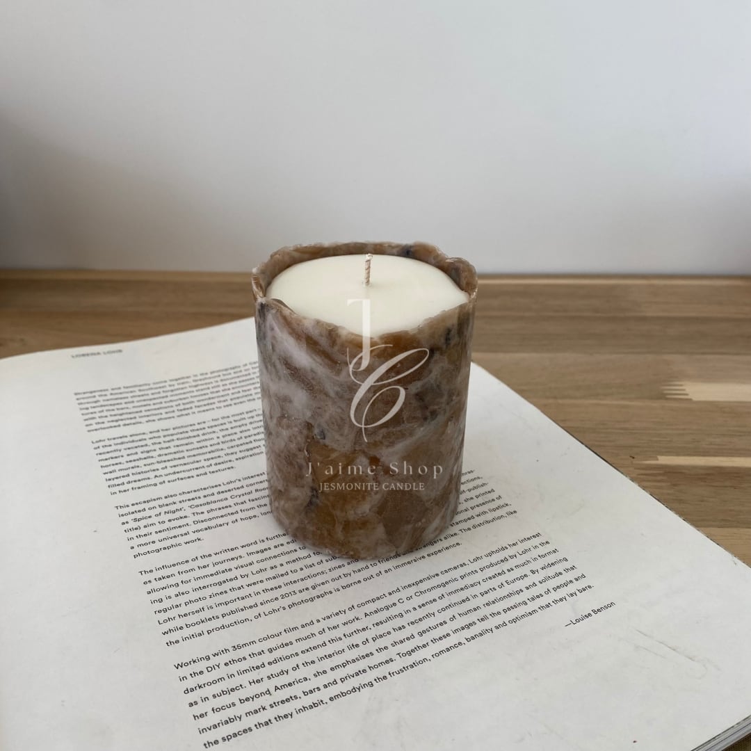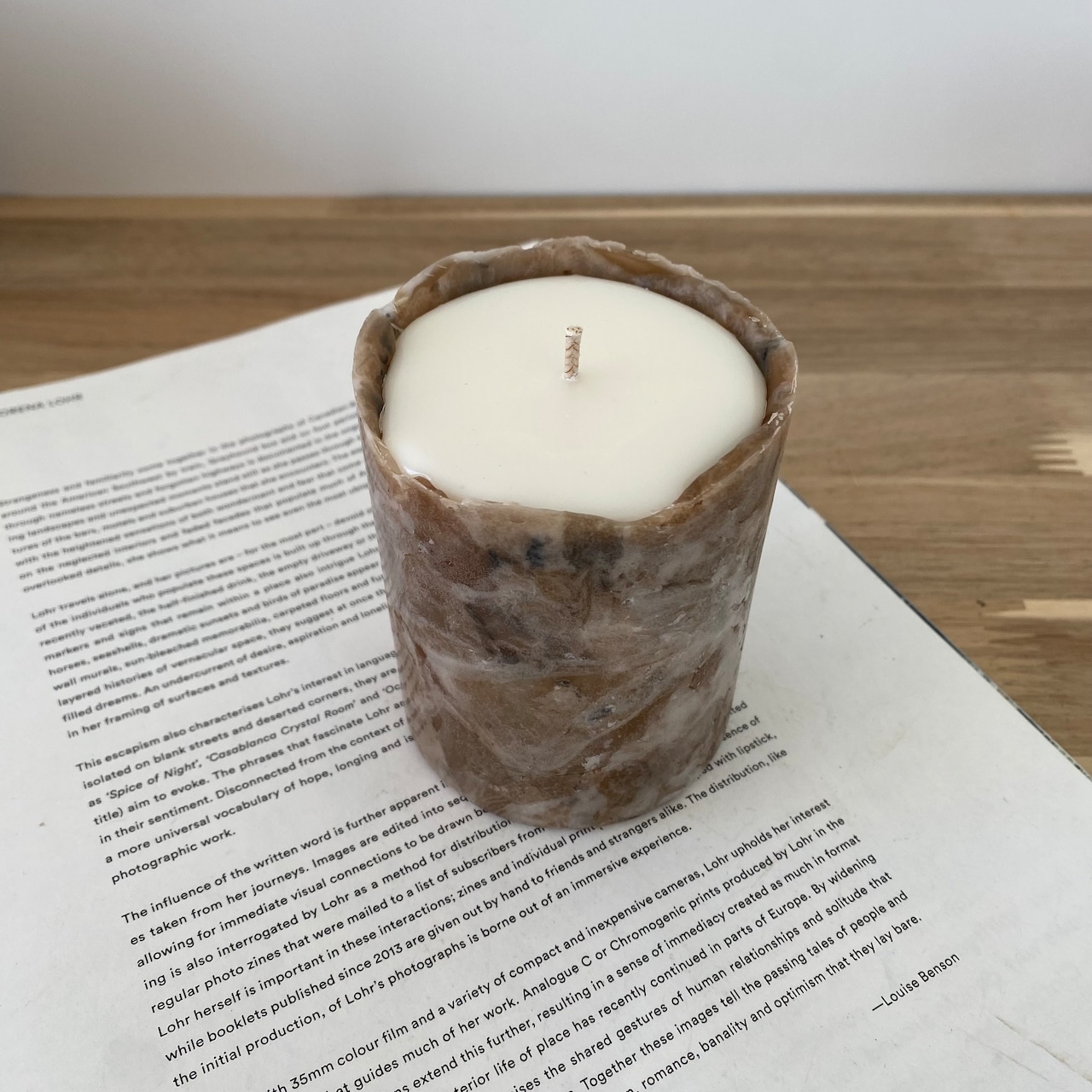 クラシックなピラーキャンドルのフォルムに、コーヒーを思わせる深みのある色彩と風合いを纏わせたデザイン。