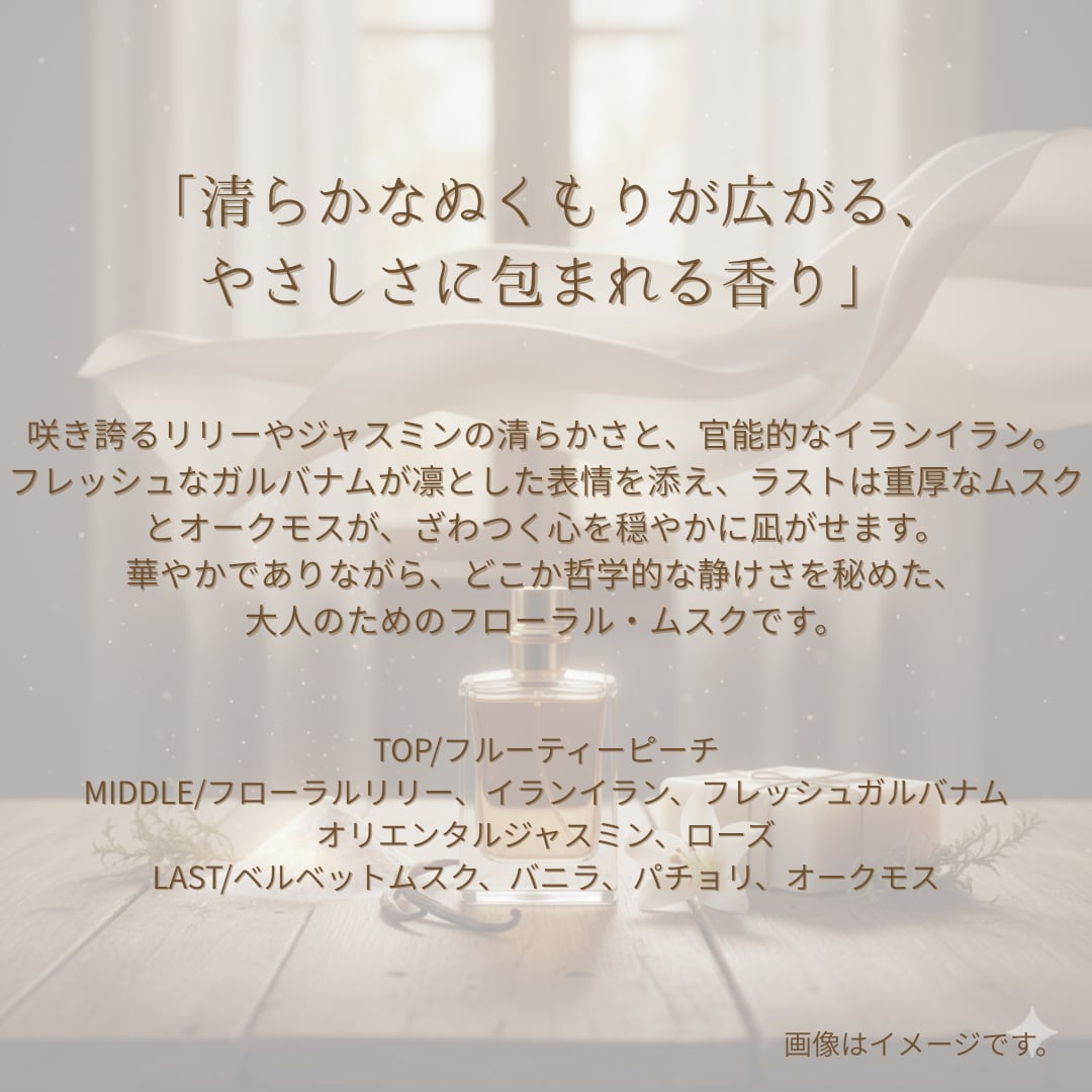 やわらかな甘さと穏やかな花々が重なり合い、洗練されたムスクの余韻が、静かに心を満たします。